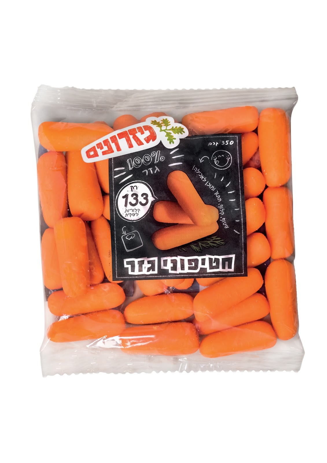 חטיפוני גזר – קטנים, שובבים וטעימים בצורת גזר קלאסי. רק 38 קלוריות ל- 100 גרם.