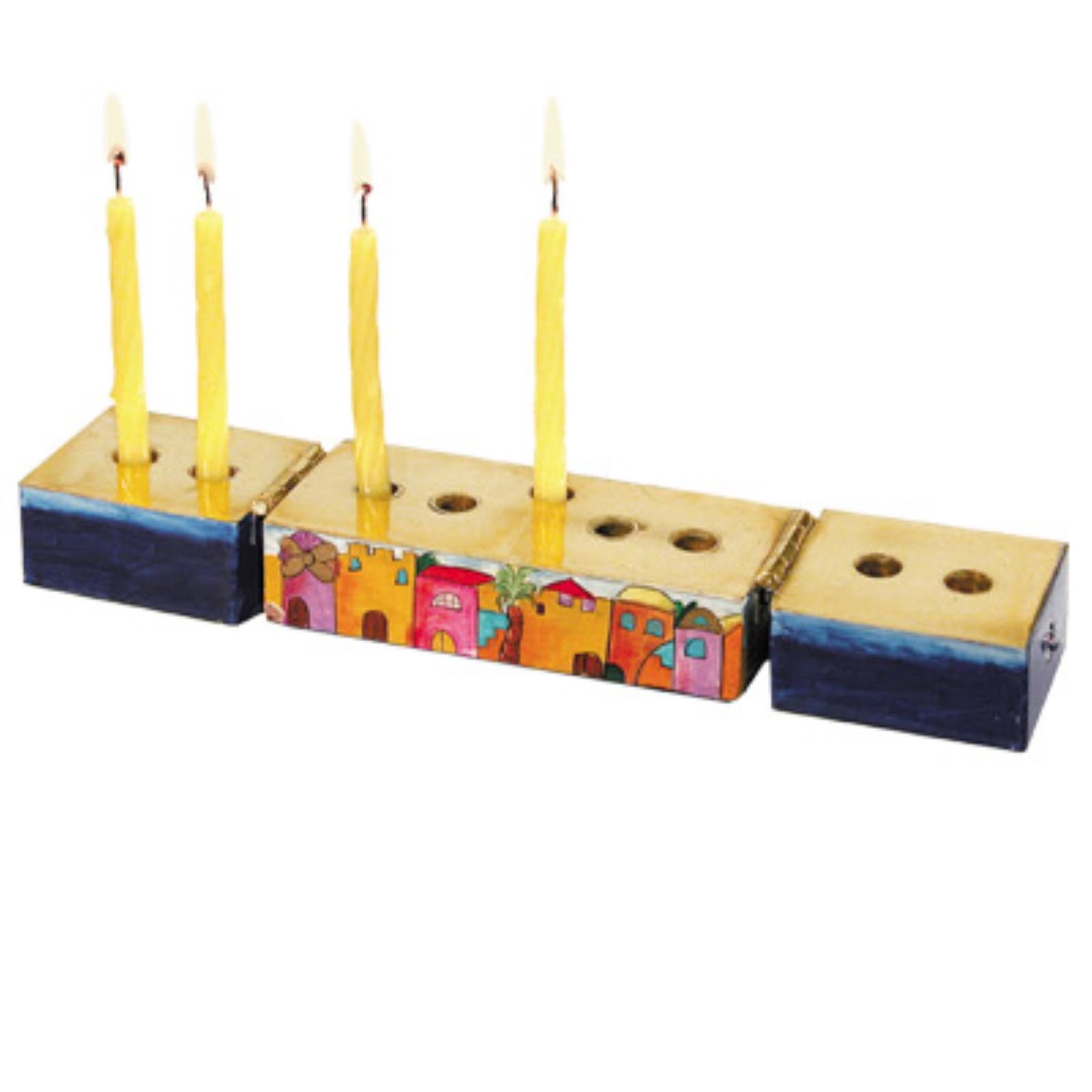 החנוכייה המודולארית עשויה מעץ איכותי בציפוי מתכת, המשלב ציור ידני של העיר ירושלים או הדפס פרחוני ? בשאר ימות השנה, הופכת ברגע לזוג פמוטים להדלקת נרות שבת.