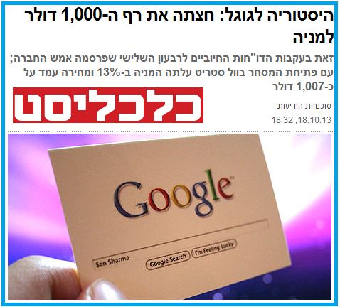 היסטוריה למניית Google. המנייה חצתה את 1,000 הדולרים וקבעה שיא חדש. הדו"חות לרבעון השלישי שפורסמו על ידי החברה הביאו לעלייה המשמעותית ולחציית הרף, כך פורסם באתר "כלכליסט".