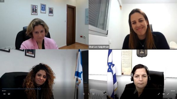 נפגשות בזום: למעלה שי-לי שפיגלמן, מנכ"לית משרד המדע והטכנולוגיה, יעל מבורך מנכ"לית המשרד לשוויון חברתי, למטה: סיגל יעקובי, ממלאת מקום מנכ"לית משרד המשפטים ולירן אבישר בן חורין מנכ"לית משרד התקשורת