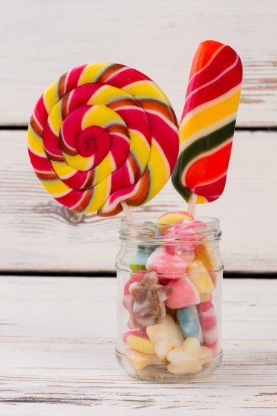Colorful lollipops and jellies in glass jar. Delicious candies on wooden background. Party dessert for kids.