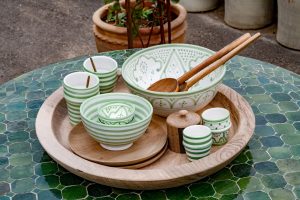 מארז קומפלט- המארז כולל קערה מצוירת, 2 כפות עץ להגשה, 2 כוסות בילדי פסים, 2 כוסות אספרסו, קופסת עץ, קערת פסים, 2 קעריות קטנות מצוירות, צלחת הגשה מעץ אגוז. מחיר 849 ₪.