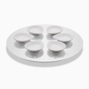 צלחת פסח מודרנית וחגיגית להגשת מאכלי החג המסורתיים המעוצבת בסגנון קלאסי ומעוטרת בחריטות שמות המאכלים. מחיר: 590 ₪