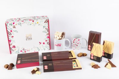 או מארז חן, הכולל תשיעיית פרלינים משובחים בעבודת יד ו-2 ספלים ממותגים להכנת משקה שוקולד חם עם שקיק נטיפי שוקולד ומיני מרשמלו להכנת המשקה. מחיר המארז - 210 ₪