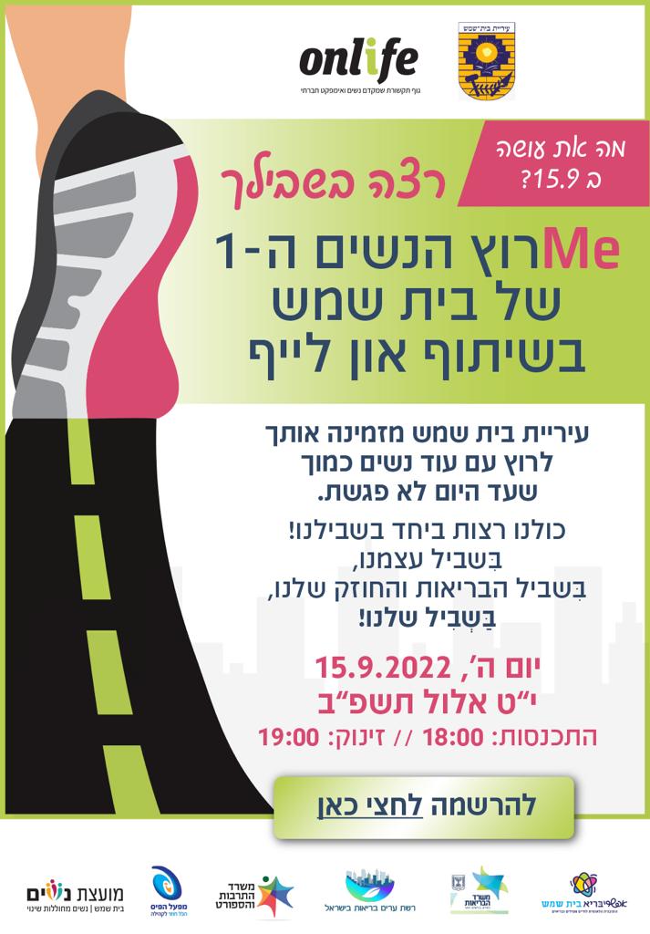 און לייף ועיריית בית שמש שמחים להזמין אותך לmeרוץ הנשים הלילי הראשון של בית שמש. אנחנו מזמינים אותך לרוץ, קודם כל בשבילך, בשביל עצמך, בשביל הבריאות והחוזק החיצוני והפנימי שלך.