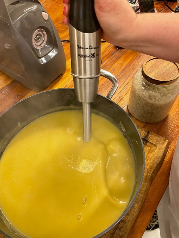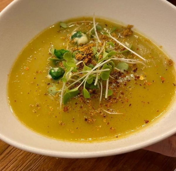 מקלפים וחותכים את כל הירקות לקוביות גדולות. בסיר גדול מחממים שמן זית ומאדים בו את הירקות ואת האפונה היבשה על להבה נמוכה עד שהם מתחילים להתרכך. לאחר מכן מוסיפים את השום ואת התבלינים, מערבבים טוב ומוסיפים מים או ציר ירקות עד מעבר לגובה הירקות. מבשלים עוד כשעה עד שהאפונה מתפרקת והארטישוק הירושלמי רך לגמרי. לסיום, טוחנים בעזרת בלנדר מוט עד למרקם הרצוי ומגישים בקערות אישיות עם זילוף דק של שמן זית, עלי מיקרו מעל ומעט צ'ילי אדום יבש.