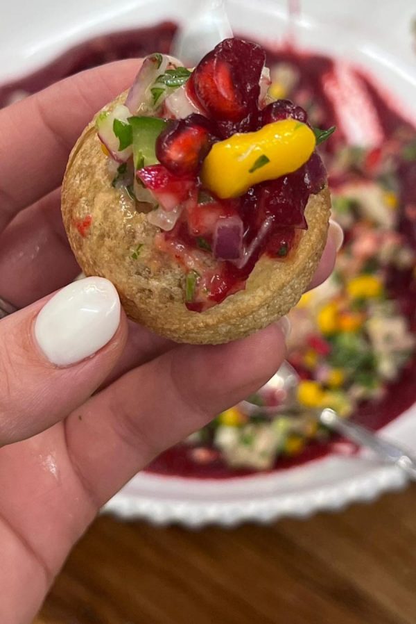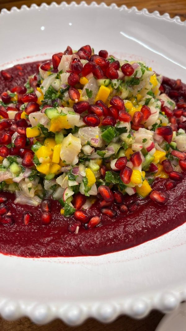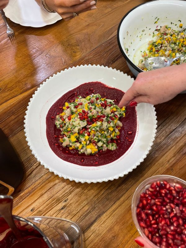 טיפ לצלחות צבעוני ומגרה- בצלחת יפה משטחים שכבה אחידה של קרם סלק ומעליו מניחים את הסביצ'ה, ומפזרים גרגירי רימון לקישוט. אופציה נוספת- להכניס את הסביצ'ה לתוך כדורי פאני פורי ולצקת את הקרם מעל. משאירים חלק מהקרם בקערית בנפרד וכל אורח יכול למזוג לעצמו מעל הסביצ'ה.