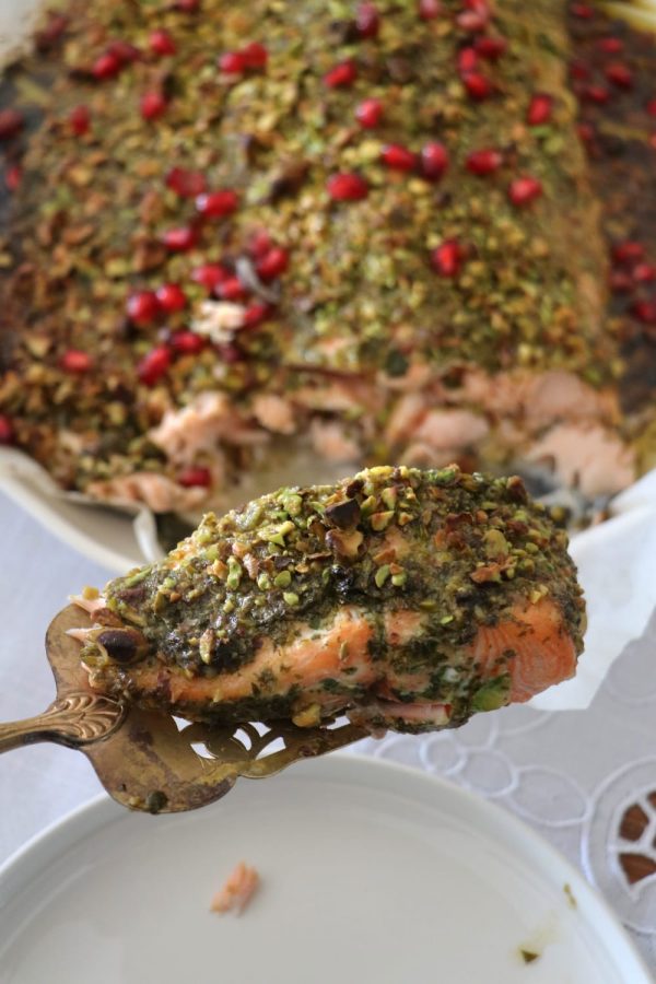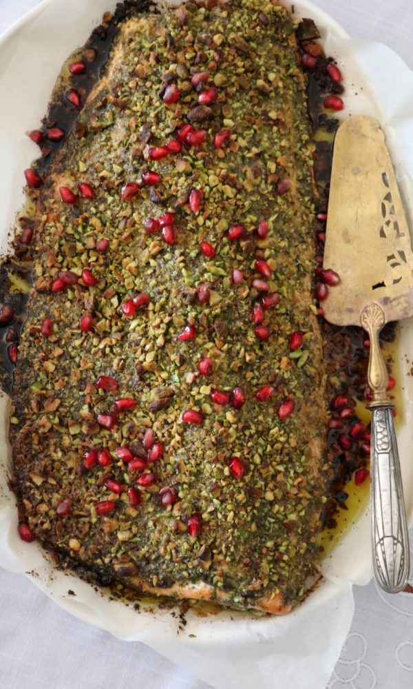 סלמון שלם בשמיכת תבלינים ופיסטוקים