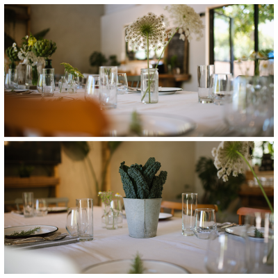 אחרי החופה התכנסנו כולם לחלל המרכזי, אולם ממוזג המעוצב בטוב טעם וכולל גם את המטבח, שבו הוכנה לנו ארוחת ערב מהשף, המבוססת, איך לא, על טהרת הגידולים במקום, דגים, וגם פיצות לילדים. במרכז החלל שולחן אחד גדול המכיל את כל המוזמים ויוצר את ה"ביחדנסס", אוכל טעים, יין ללא הגבלה, ומצב רוח טוב.