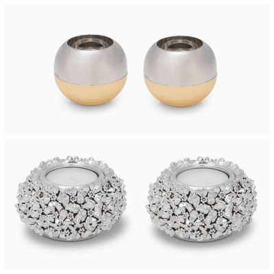 דגם "פרחים" בציפוי כסף בציפוי כסף במחיר 300 ש"ח, או זוג פמוטים קריסטל על בסיס מגש תואם בציפוי כסף במחיר 190 ש"ח.ואו זוג פמוטים מצופים כסף בשילוב זהב בסגנון מודרני ובמחיר ₪199
