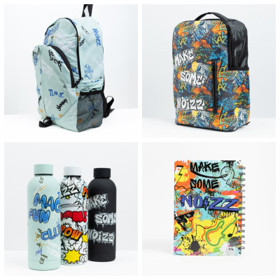 קולקציית תיקים, קלמרים, בקבוקים, ומחברות ממותגים, של המותג Noizz