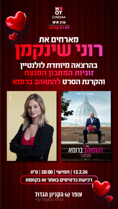 ביום חמישי ה-12.2.26, ערב וולנטיין, תוכלו לבלות ערב רומנטי המשלב הרצאה מרתקת: "זוגיות המתכון המנצח" על יחסים בינו לבינה, עם הבלוגרית רוני שינקמן, ולאחר ההרצאה יוקרן סרט קומדיה רומנטית נוגעת ללב: להתאהב ברומא.