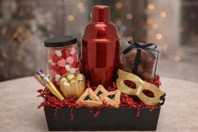 לאבות ולגברים בחיינו משלוח עם שייקר להכנת קוקטיילים המשולב לצד שוקולדים ועוגיות