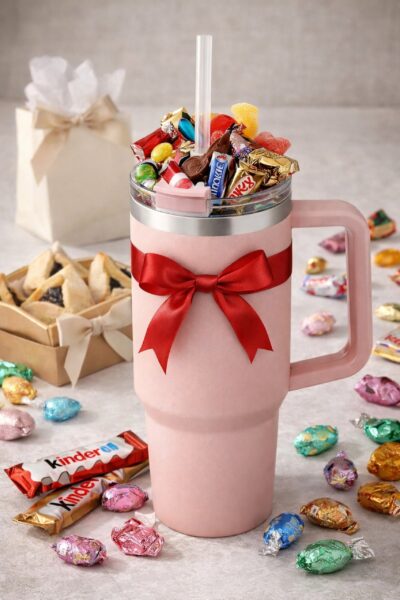 משלוחי מנות לילדים עם כוס תרמית וקשית מלאה בממתקים,