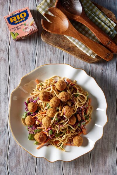 מכינים את הסלט, שופכים מעל את הרוטב ומערבבים. מכינים את כדורי הטונה: מערבבים את כל מרכיבי הכדורים בקערה, יוצרים כדורים קטנים ומטגנים בשמן עמוק. מניחים את הסלט בצלחת עמוקה מעט ומסדרים מעליו את כדורי הטונה.