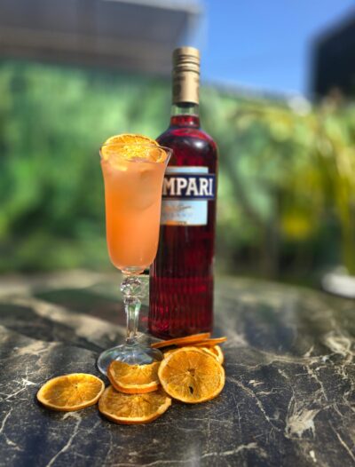 45  מ"ל קמפרי (כשר לפסח), 30 מ"ל מיץ אשכוליות אדומות, 45  מ"ל מיץ תפוזים, 45  מ"ל מיץ לימון טרי. לקשט בפלח תפוז מקורמל עם סוכר חום למראה יוקרתי וטעם מעושן קלות.