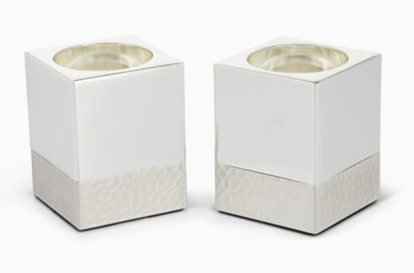 זוג פמוטים המרינג מצופה כסף בעיצוב נקי של משטח חלק וגימור מרוקע עדין בחלקו התחתון. מחיר לפני ההנחה: 347 ₪  מחיר חג: 199 ₪. מותנה ברכישה מעל 299 ₪.