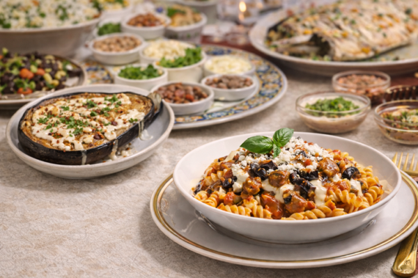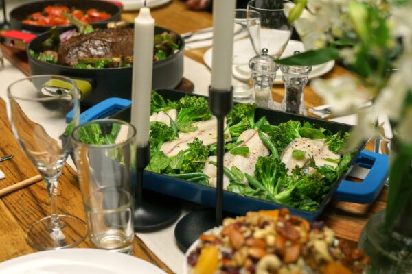 הגשה כחלק מהעיצוב, הסטייל היום הוא שהמעבר מהמטבח לשולחן אינו חייב לכלול שלב ביניים של העברת האוכל לכלי הגשה נפרדים. הניחו על השולחן כלים שבהם בושלו המנות, סוטאז’ים רחבים, סירים מעוצבים ותבניות איכותיות לצד קערות ותוספות. מראה טבעי ולא מתאמץ וגם שומר על חום האוכל. כלי יפה הופך לחלק מהקומפוזיציה ולא רק לאמצעי פונקציונלי.
